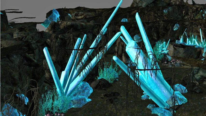 I decided that I wanted to request some new crystal assets specifically for my cave. However, I knew that other departments already had a lot on in terms of workload, so I asked if a recolour of the exisiting crystals would be possible. This was done first, and allowed me to add golden hues into the cave spaces.