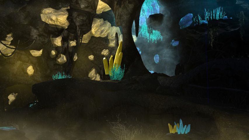 This blue and gold contrast was an interesting mixture, with some unusual effects that resulted in the eventual lighting. On the whole, my intention was to draw the player’s eye toward the promise of something different, encouraging their descent further into the cave. It’s also a direct change in temperature on the colour wheel after the relentless blues of Blackreach and the rest of the exterior space’s blue tones.